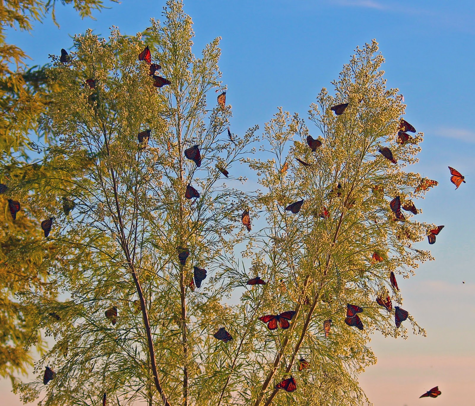 | Dispersal of monarchs into a nearby tree after sunset |