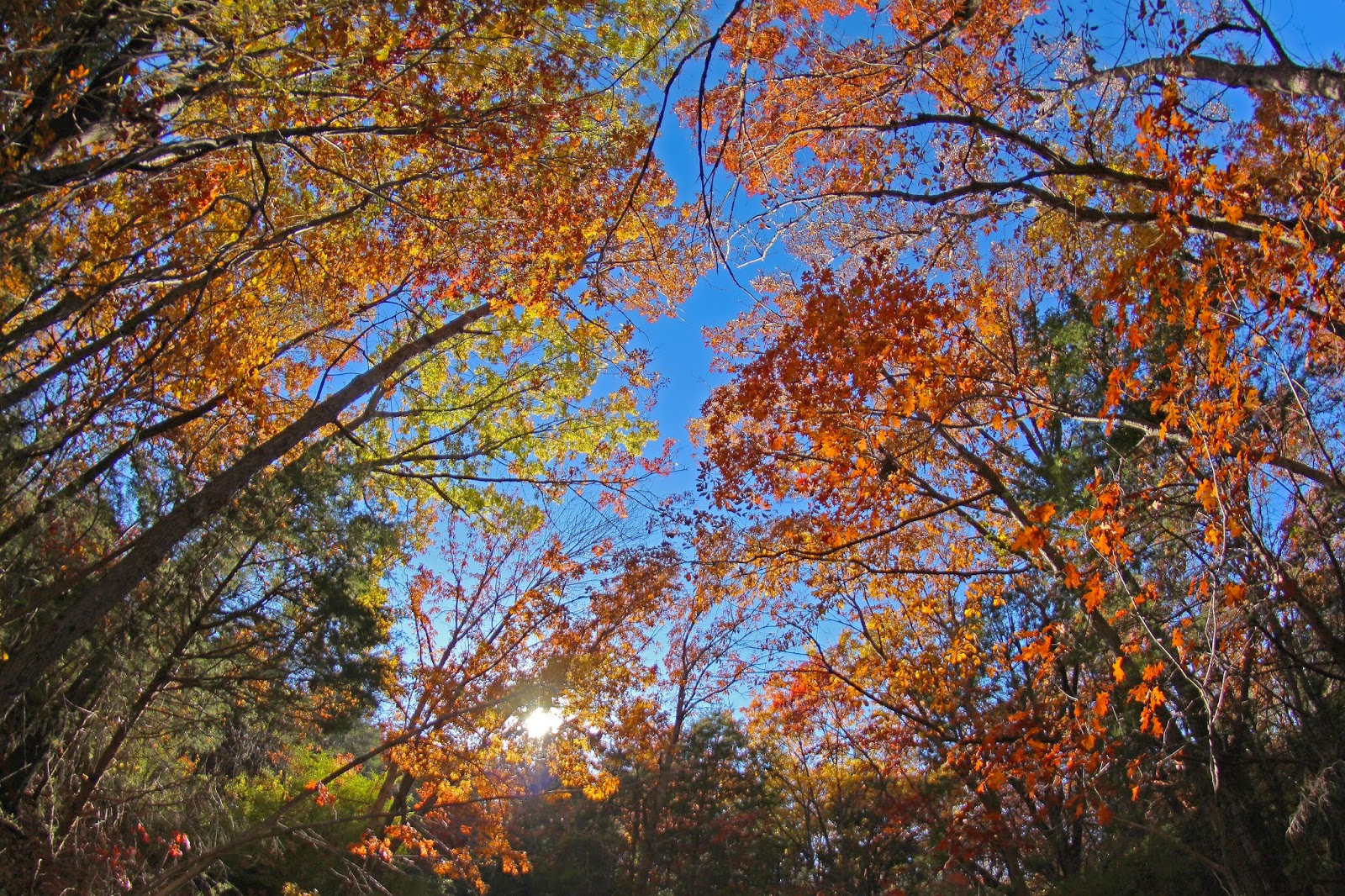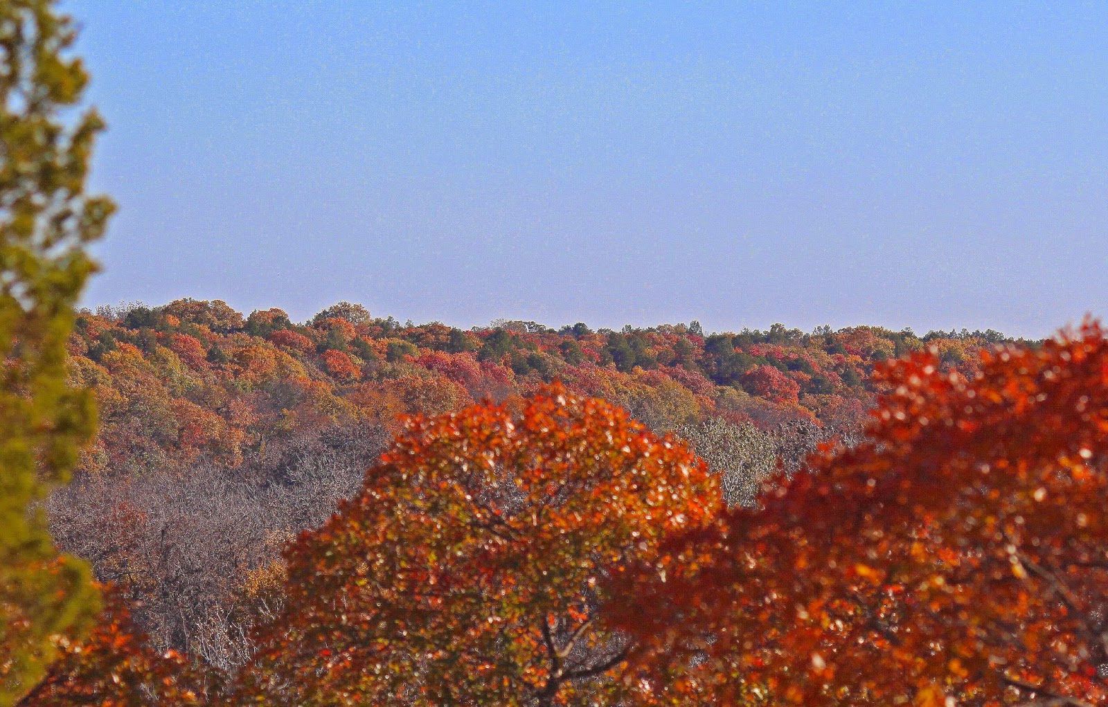 | Vivid colors of oak and elm contrast the deep blue sky in the bottoms below Scyene Overlook |