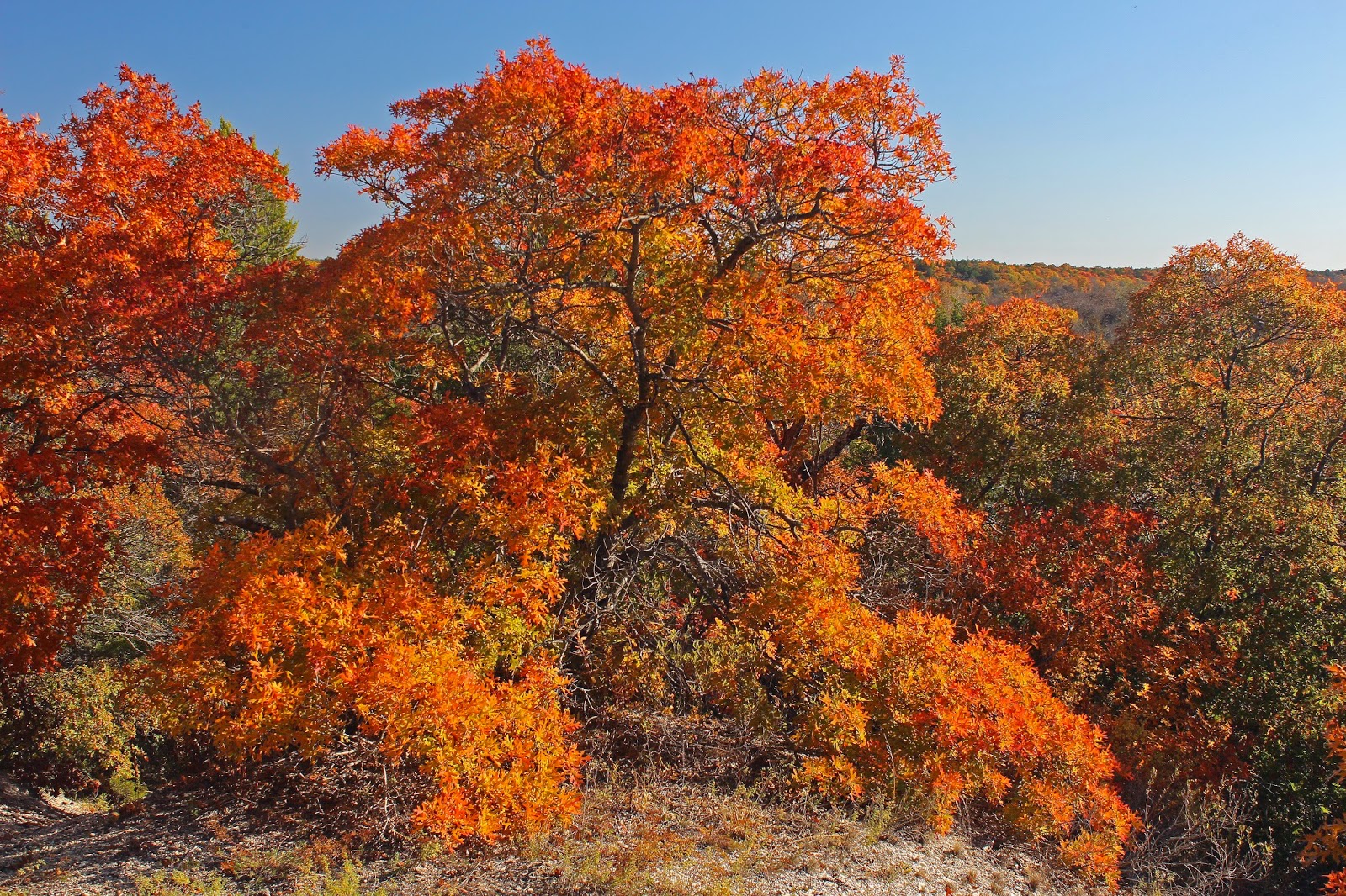 Vivid colors of oak and elm contrast the deep blue sky in the bottoms below Scyene Overlook |