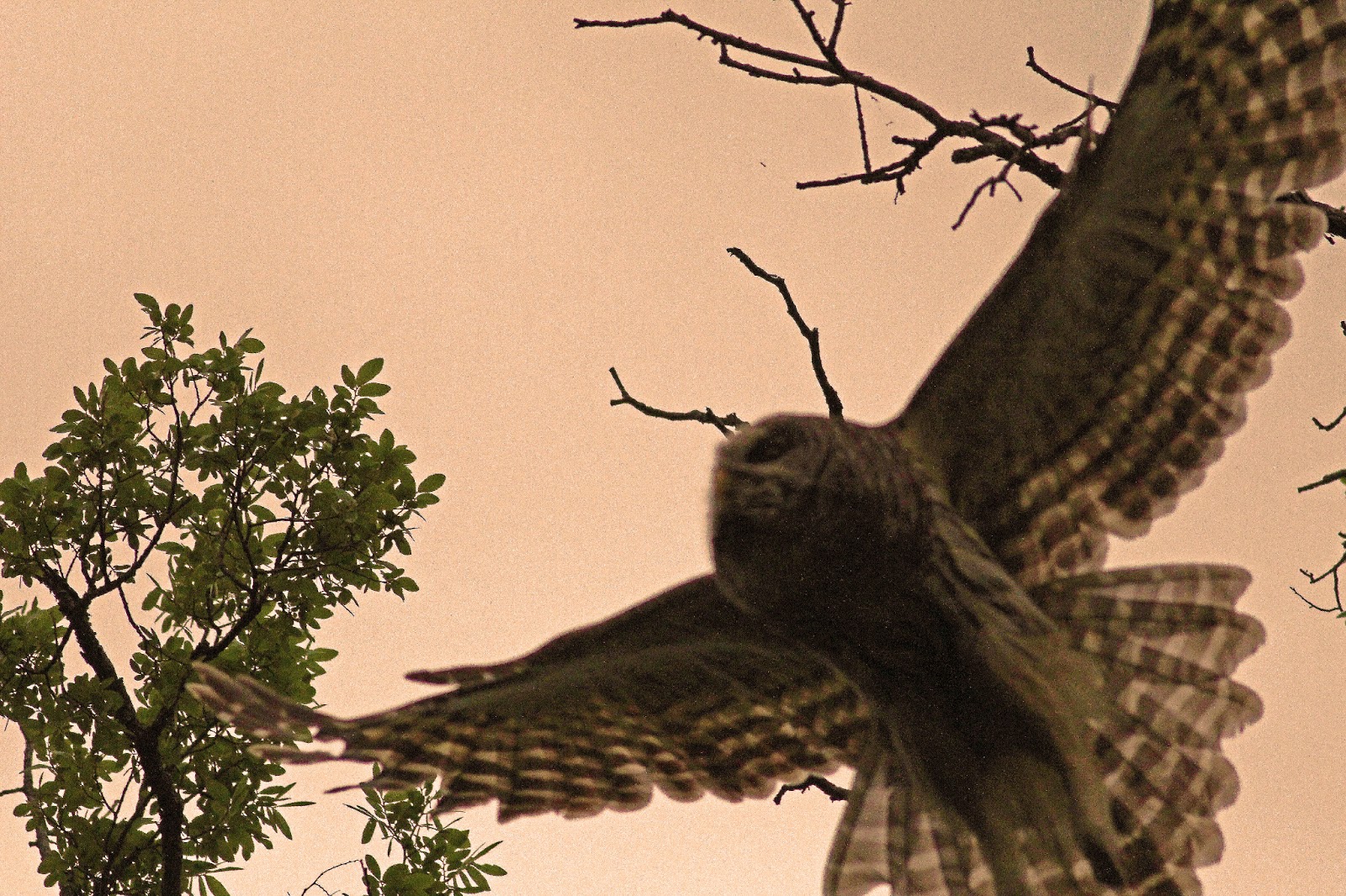 | Male Owl flying towards the sound of foreign Barred Owls |