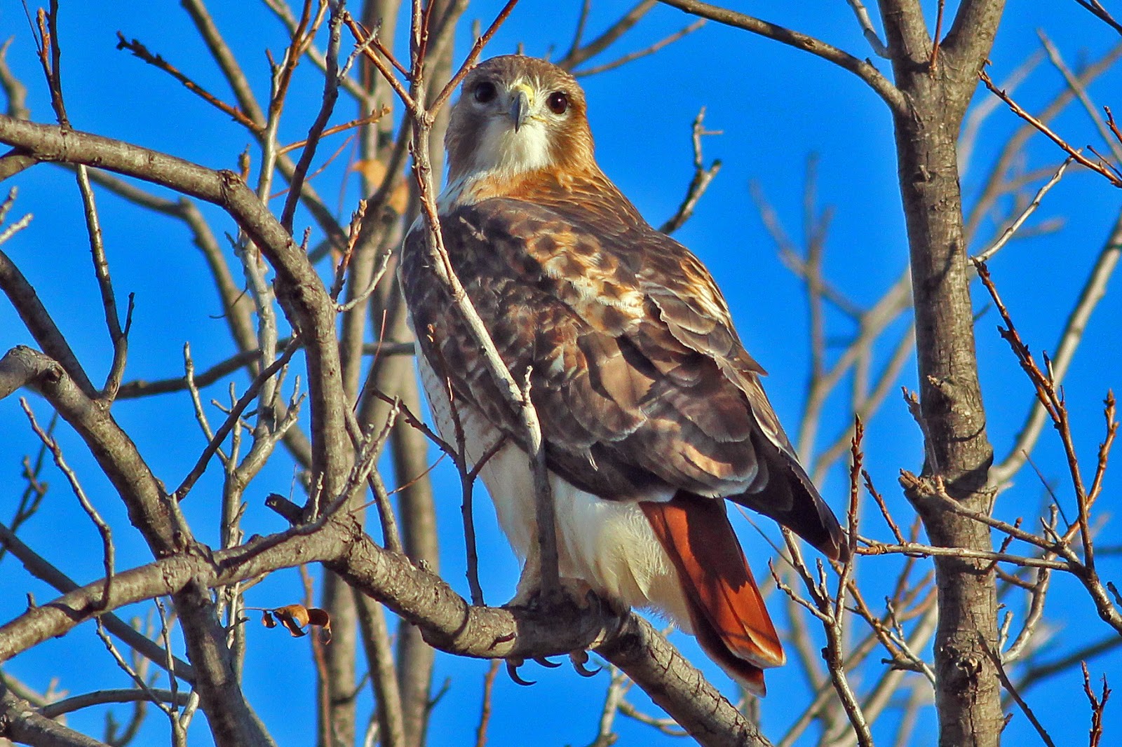 | The year round resident Red-Tailed Hawk in one of the pecan trees near the Bur Oak |