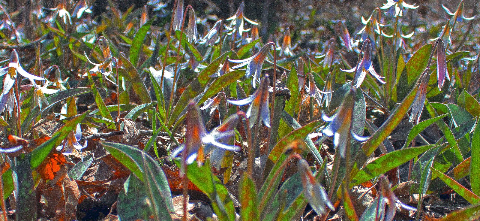 The flowering cycle for the Trout Lily begins and ends very quickly, only a few days at most. The flowers are usually closed in the morning and open by mid-afternoon. The early bird does not get the worm if looking to photograph these colonies. Better to wait late in the day or towards sunset to see them fully open.