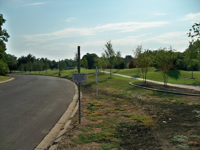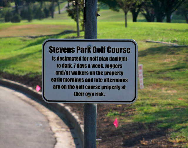 The southern end of the trail abruptly stops just on the south side of the Tennis Courts. Plans are in the works to expand the trail south at some point. Until then, the city seems to tolerate foot traffic on the golf paths through the golf course. Most public courses require a green fee to be paid prior to entering a golf course, Stevens Park seems to have made an exception per this sign: