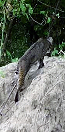 North Texans seem to have a hard time identifying a bobcat. Since bobcats are usually nocturnal they can easily be seen as something larger like their distant cousin the mountain lion. Light, distance and space can often confuse your eyes into seeing something that is not there. The illustration above shows the main differences between the larger mountain lion and the bobcat. 3 feet long for a bobcat, 7-8 feet long for a mountain lion. Similar coat colors, similar markings. I think many people can get confused especially when a bobcat turns away from the person viewing it. Below is the same bobcat on the Trinity. When viewed at the rear quarter, the bobbed tail is much less pronounced and the coloration of the foot at the base of the leg resembles that of a mountain lion tail.