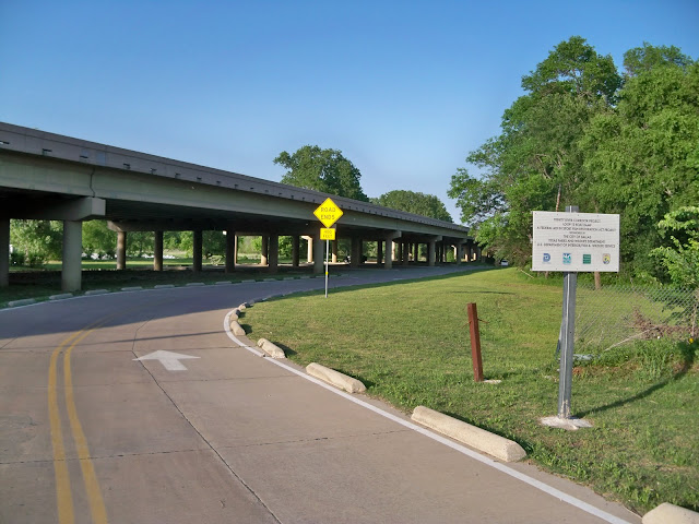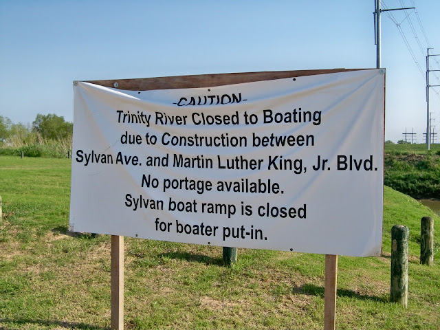 The signs above were originally placed along the river during the summer of 2010 when the Trinity River was originally moved from the traditional streambed for the coffer dam construction for the Dallas Wave/Standing Wave whitewater project. The signs as of April 2011 are still in place. Overhead construction for the Santa Fe Trestle Trail is ongoing in this area.