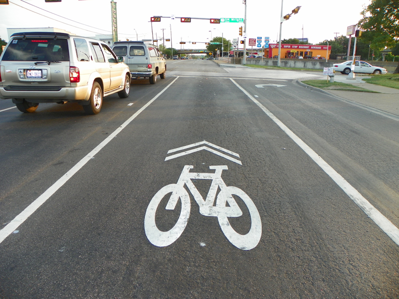 | Sharrow stenciled into the pavement Main @ Exposition Deep Ellum |