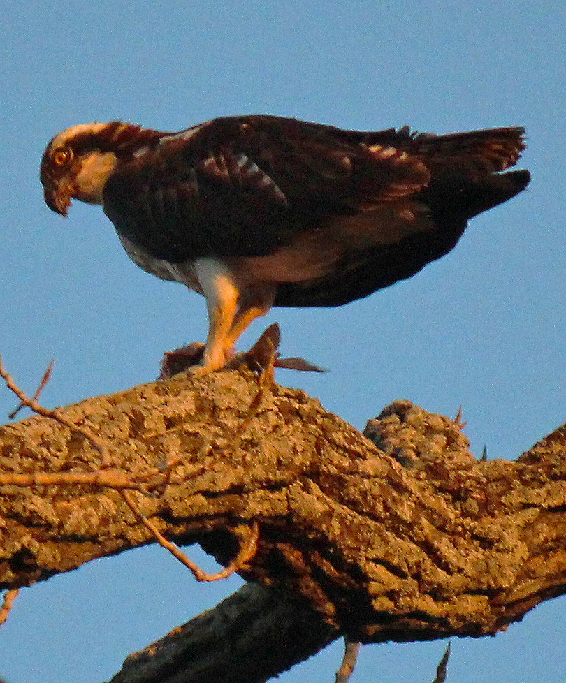 | Osprey (Fish Eagle) feasting of a freshly caught carp in Dallas Texas under a rising moon |