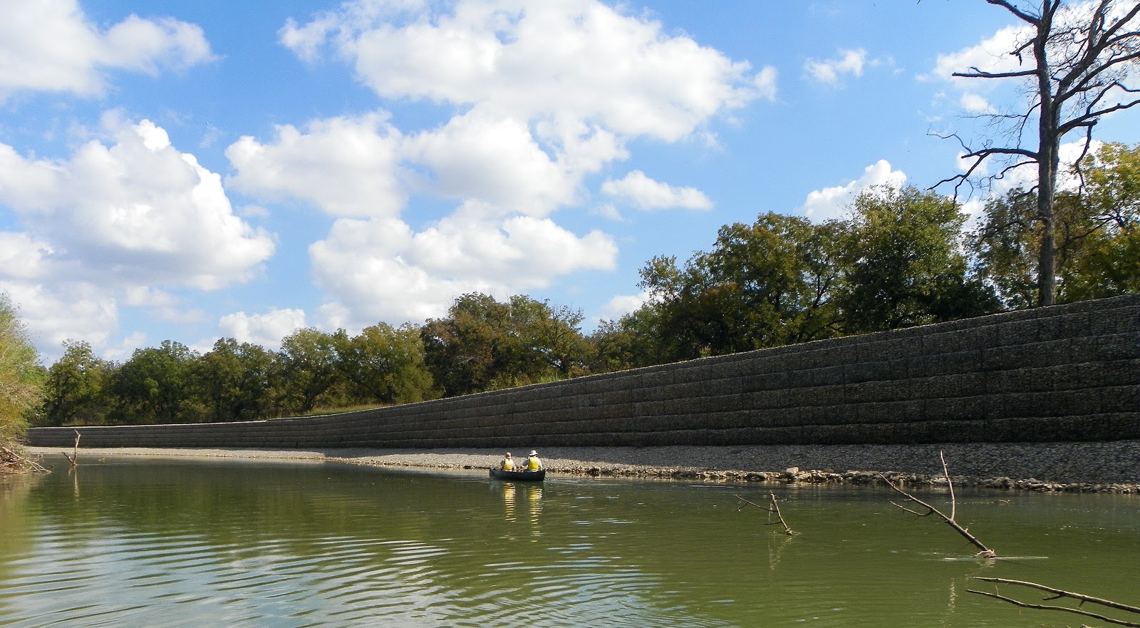 A year behind schedule and much larger than originally planned, the monolith of a 2012 Dallas Water Utilities construction project commands the south bank of the Trinity River. The wall was built to protect a 72 inch water main that runs near the river. The glacial pace of construction at this site left the Trinity Trail between Simpson Stuart Road and the Audubon Center incomplete for a year and a half.