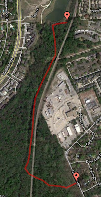 The pig rooting and tracks went as far north as Walnut Hill. I did not see any rooting in the Town Center area only pig tracks in the far treeline seen on the right side of the photo, below is a view from the woods on the south side of the Lake Highlands Town Center.
