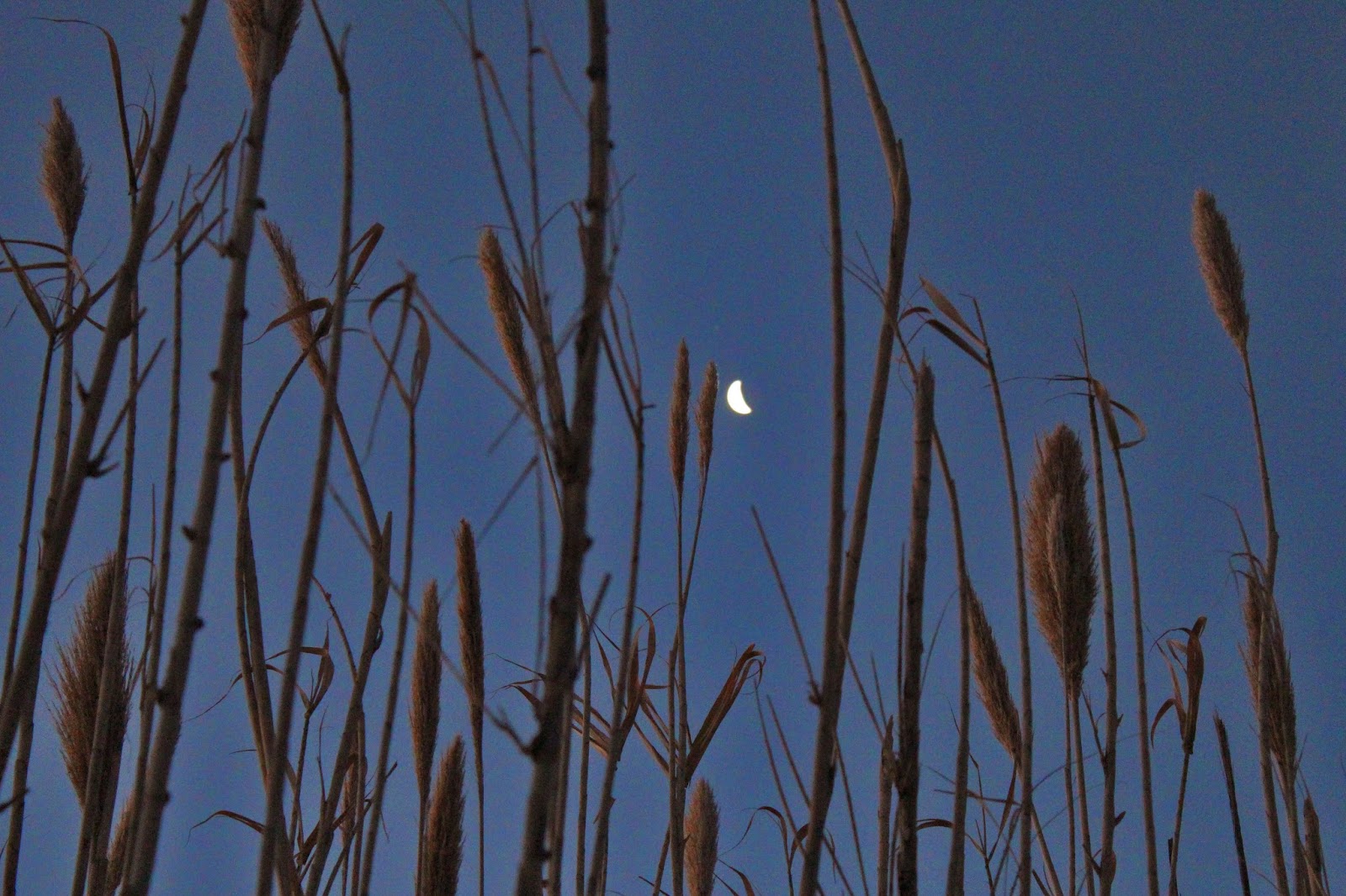 | The setting moon at dawn seen from inside a cane brake at Goat Island |