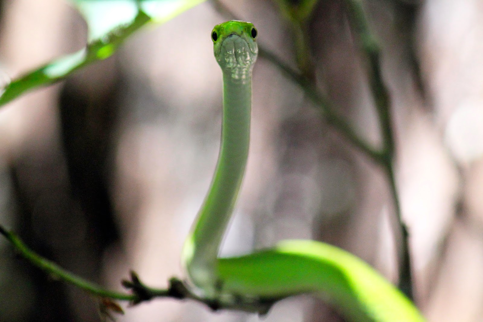Rough green snakes are typically found on forest edges near ponds or lakes. Although they are arboreal snakes, they forage in dense vegetation along pond and lake shorelines during the day. Nights are spent coiled in the branches of trees. Rough green snakes choose perches based on distance from water sources, height in branches, and thickness of the branch.