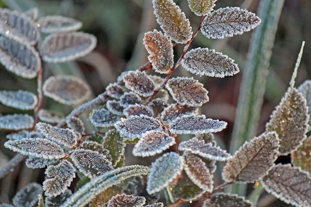 The protective blanket of the spring’s condensation only reaches so far. The plants within a stone’s throw are covered in heavy frost that more resembles coarse sugar or kosher salt. Heavy crystallized structures that glisten like jewels in the early morning light.