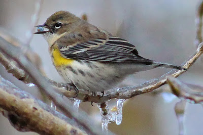 | Yellow Rumped Warbler in a driving sleet storm, Great Trinity Forest, Dallas Texas |