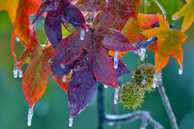 | Frozen leaves of a native Sweet Gum Tree Liquidambar styraciflua |