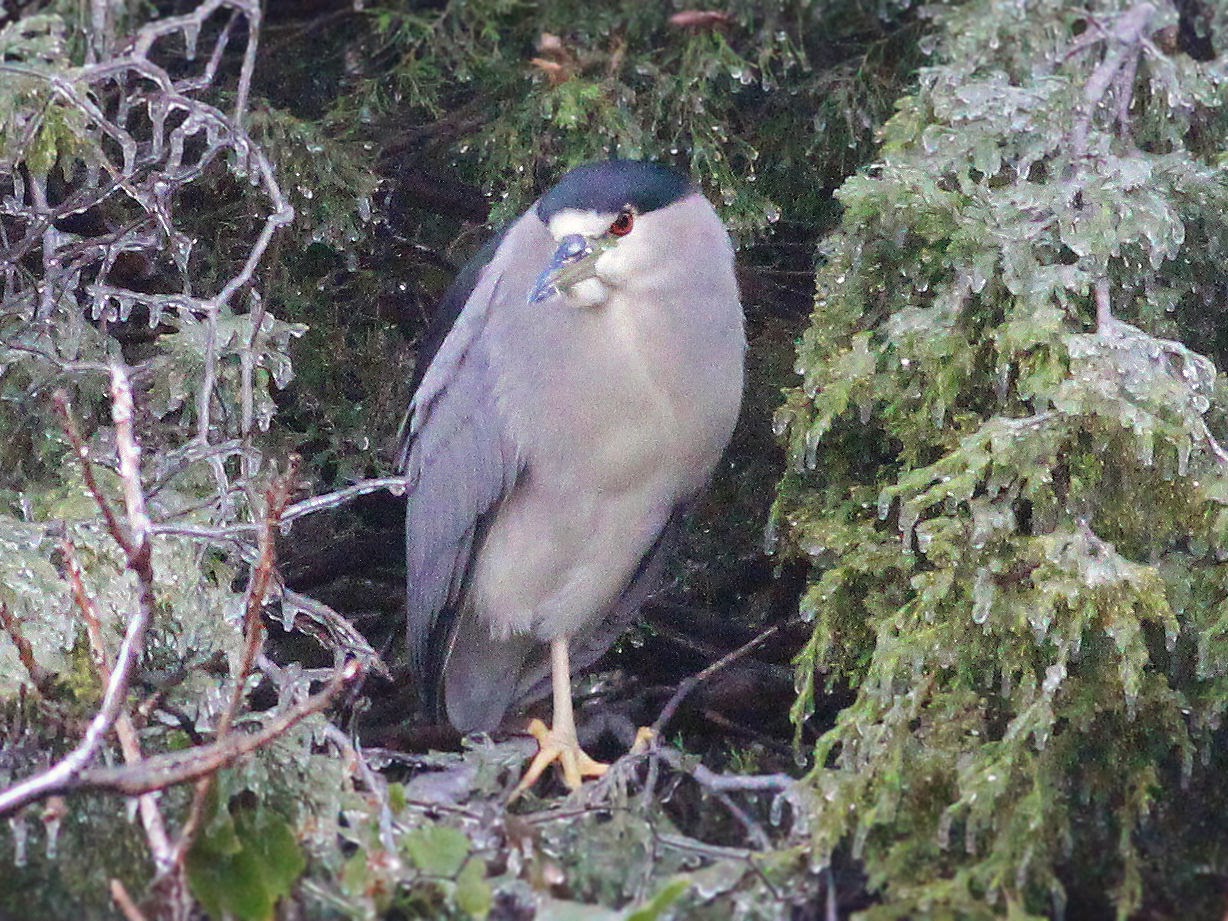 Yellow Crowned Night Herons are birds of the Old South and seeing one among the ice encrusted tree limbs of a willow has one wondering how cold a bird like this must be in 18 degree temperatures. If a bird ever looked cold, this one wins.