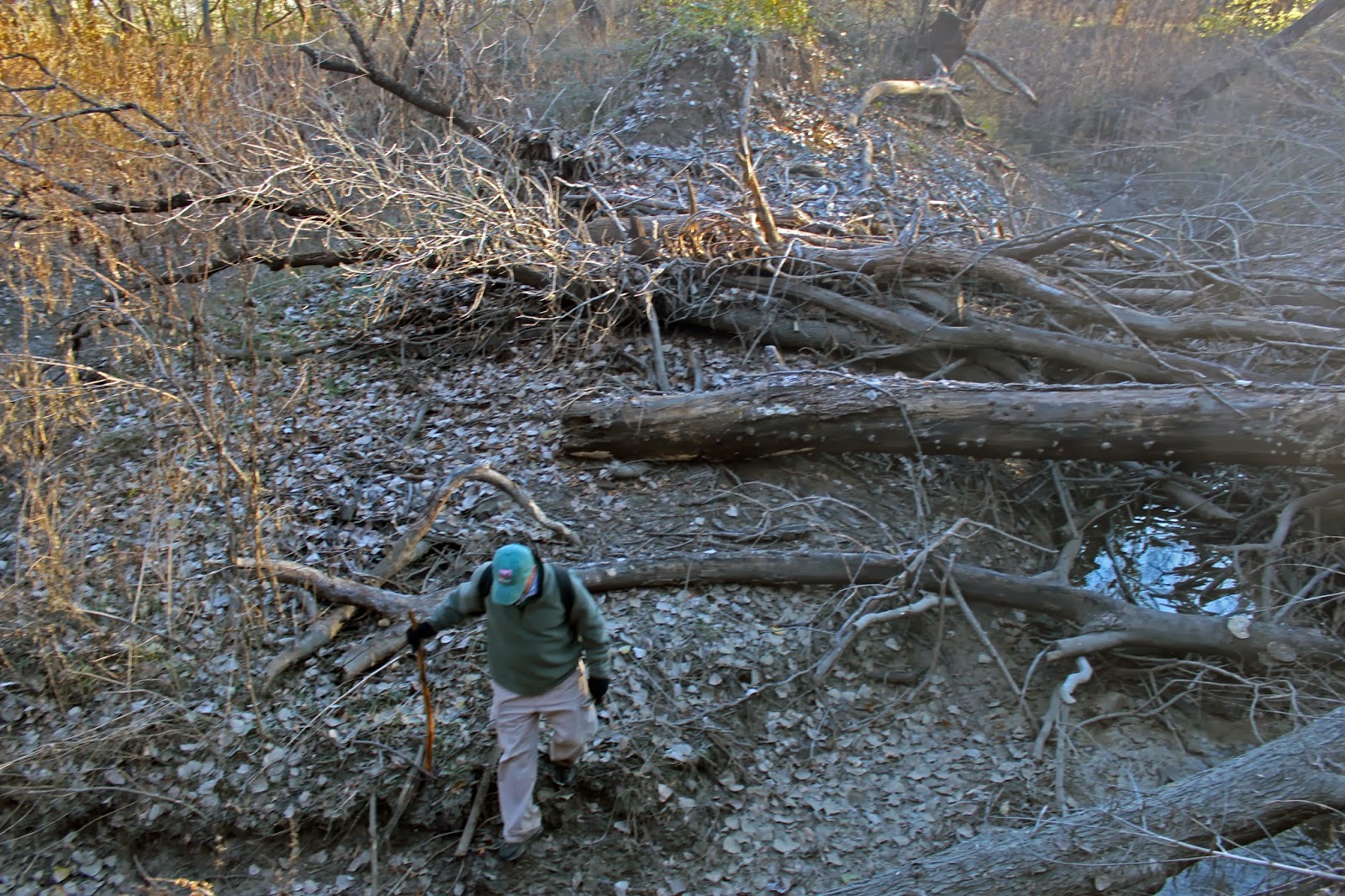 The curse of violent flash flooding is laid bare around here. The large tree trunks and rafted limb debris that make crossing the slough difficult.