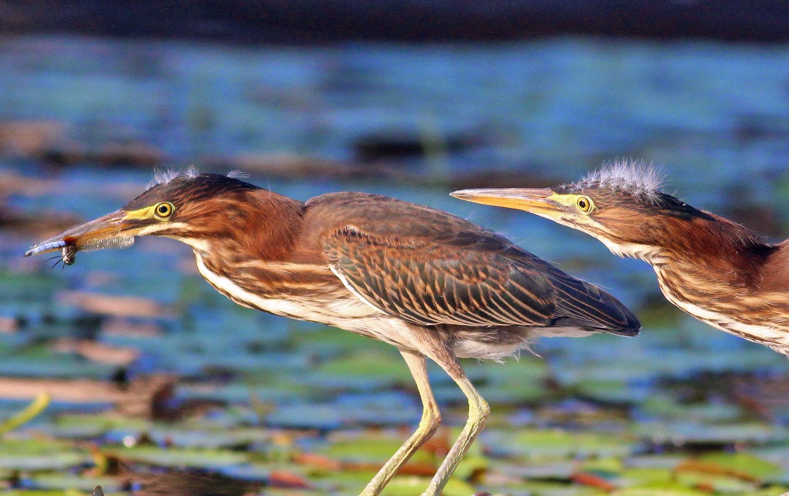 | Green Heron dancing across lilypads as it catches yet another dragonfly, this time on the run |