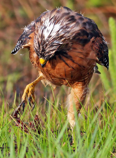 Crayfish, most likely sent into the grass after the heavy rains just minutes before were taken down by a dozen by the hawk that evening. One after the other, carefully stalked and eaten. A learned trait by the hawk no doubt. A rare treat to see such a thing.