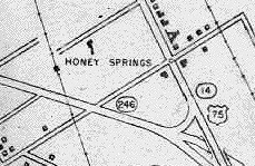 Honey Springs is near the junction of the Missouri, Kansas, and Texas railroad tracks and Honey Springs Branch, about five miles south of Dallas. Dugald McFarland was the original grantee of the land grant. The first settlers to remain in the area arrived with William Perry Overton from Virginia in 1844. Indians pointed out the two springs and abundance of wild honey in the area, and the settlers named their community Honey Springs. No organized township existed at the site until 1886, when the Missouri, Kansas and Texas Railroad came through Honey Springs. A section house was built there, which became known as Honey Springs Station. Honey Springs received mail from Lisbon, three miles west. Outgoing mail was hung on a pole for the conductor to grab as the train went by, and the incoming mail pouch was thrown from the train. Honey Springs had a population of fifteen in 1910. In 1937 Honey Springs voted to incorporate in order to avoid annexation by Dallas. In February 1946 the town voted to dissolve its corporation, and on December 18, 1946, Honey Springs was annexed to Dallas.
