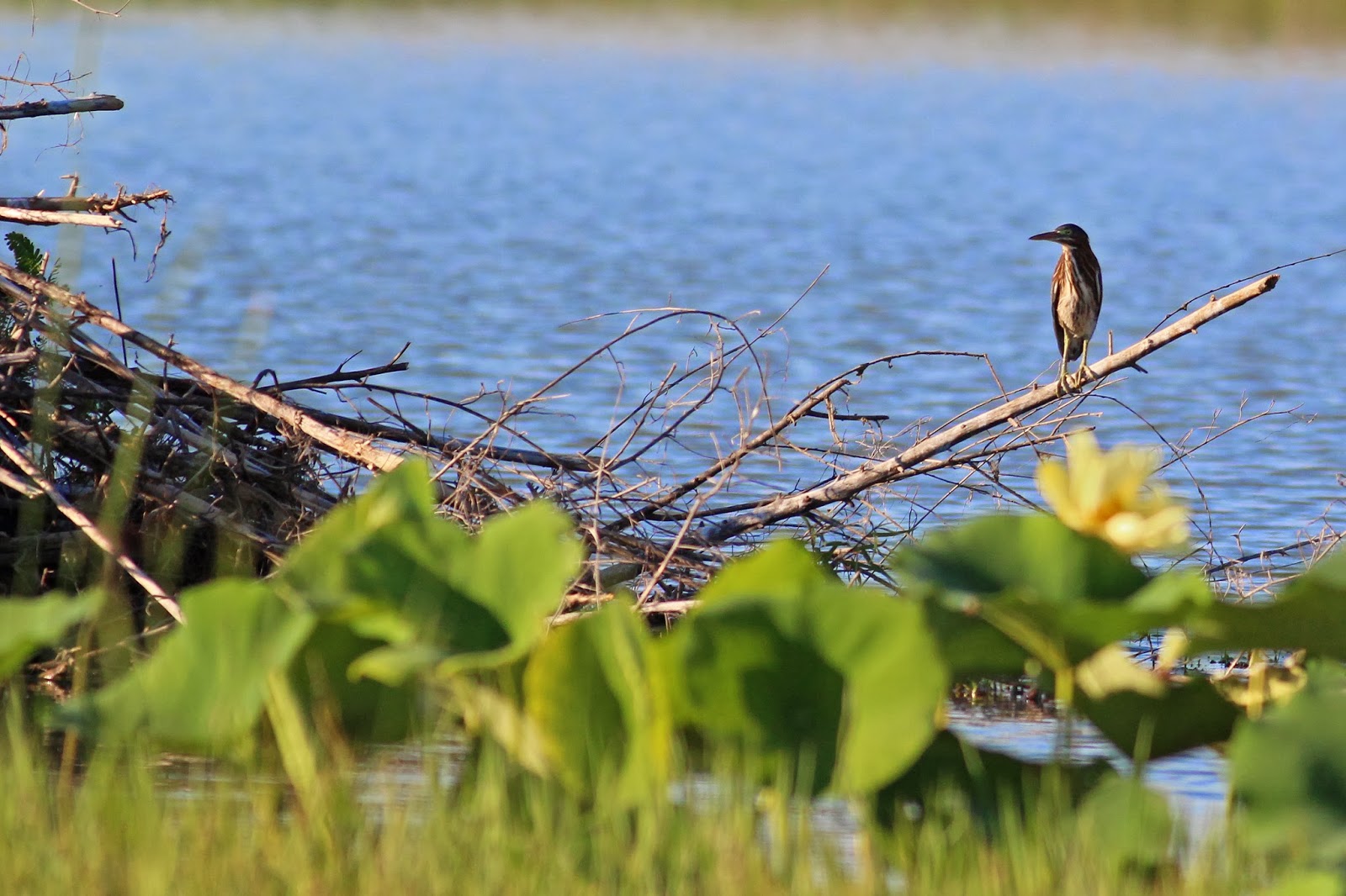 | Green Heron perched on a beaver lodge at the mouth of Honey Springs Branch |