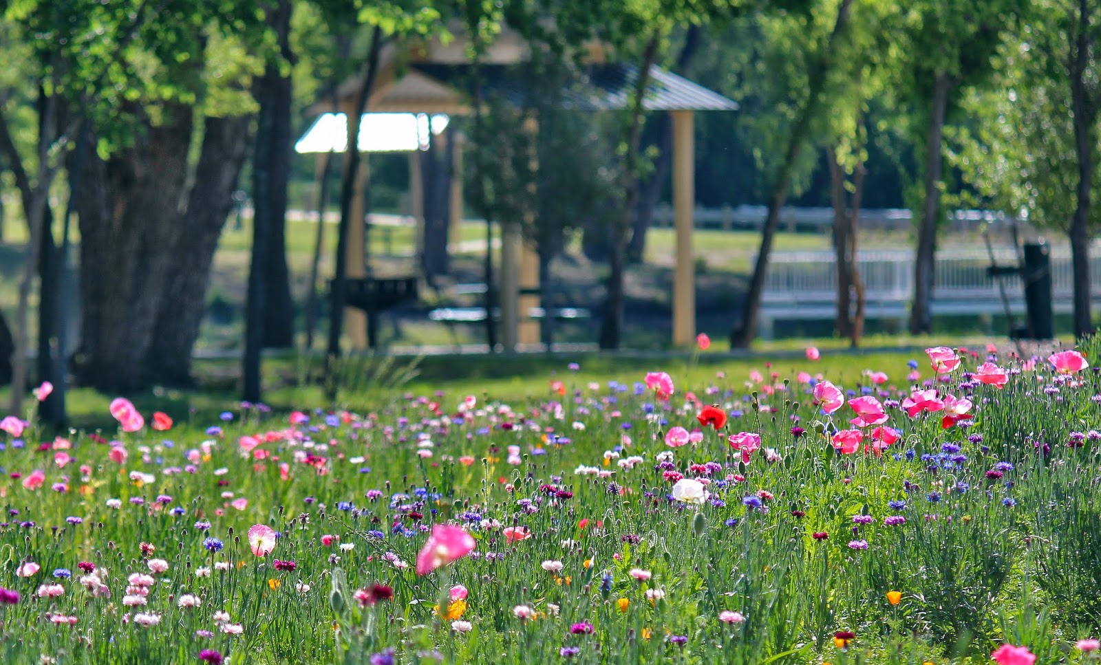 | Poppies and Bachelor Buttons at the I-20 Gateway Park, picnic facilities in the background |