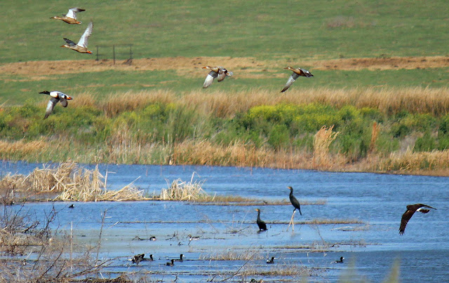 It would be interesting enough to see the water filtration process in action. There is much more. Interesting birds by the thousands call this place home. Most are of a migratory persuasion and spend a day or a week here before heading yonder to points unknown. Canada in the spring. Mexico in the fall. During the summers birds of the southern hemisphere come here during their winter. On the edge of the Flyway, the wetlands attract the occasional flock of geese not seen further west.