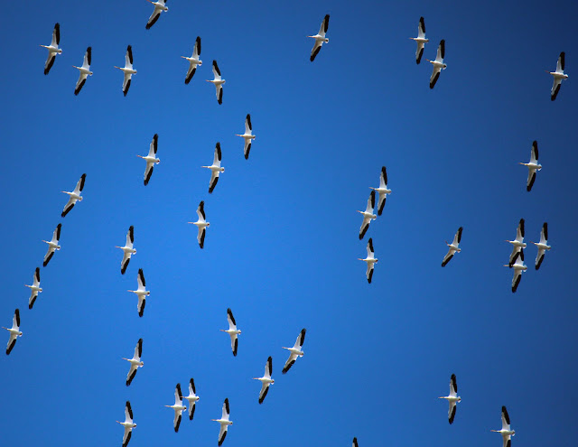 The pelicans here make regular commutes between John Bunker Sands, the McCommas Bluff Swale Lake Ray Hubbard and White Rock Lake. Able to glide vast distances using thermals and wind the near effortless rise of a flock spiraling upward is a sight to see.