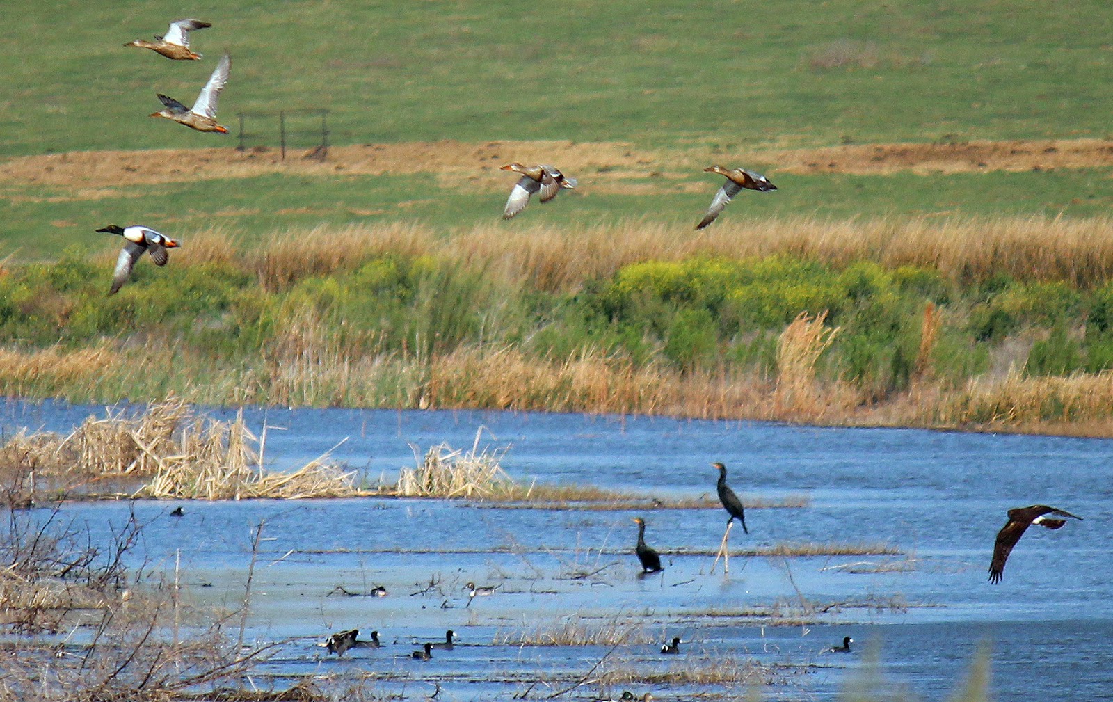 The available food supply in the cells serves as a grocery store for raptors. Hawks, Harriers and two species of Eagles work the ponds here with great precision. Unrestricted by trees and obstruction they start lengthy hunts at high altitude and then dive out of the sun at their quarry below. In the case of the Northern Harrier above, his true prey was something with four legs down in the marsh grass not the ducks that took flight at the sight.