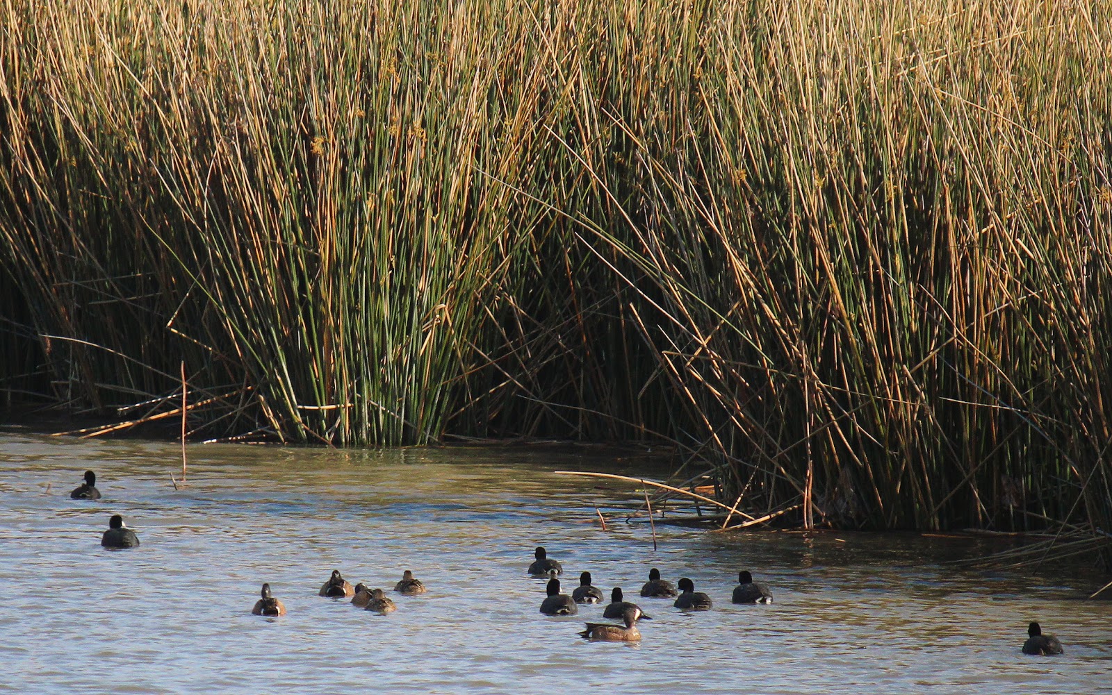 Many of the birds pack into the ten foot tall grasses and marshes that divide the wetland cells. Here the familiar American Coot (Fulica americana) and Blue-winged Teal (Anas discors) not similar in appearance but both dabblers feed together in mixed company.