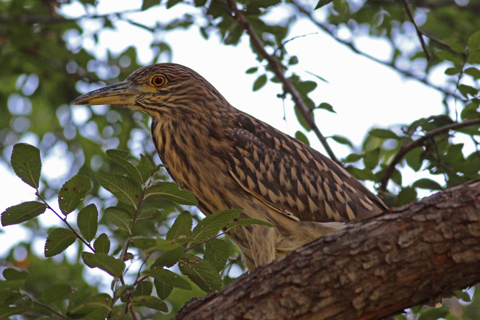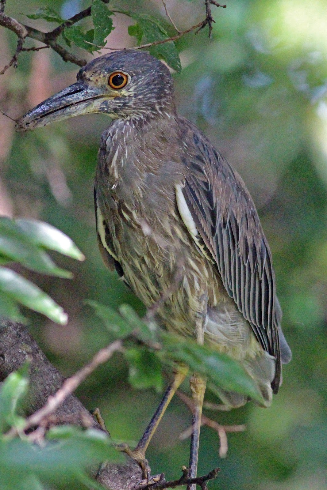 Young Yellow-crowned Night Herons do not look like the adults. They have the same bulky black bill, but their feathers are brown with white markings. The young have orange eyes and greenish legs. They are almost identical to the young Black-crowned Night Heron, but the young Yellow-crowned has longer legs and it stands with a more upright posture