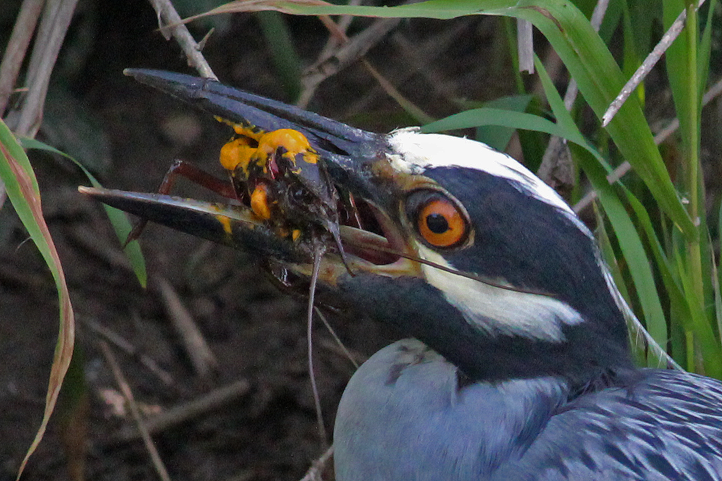With a quick dancing motion, the dagger like bill stabs its prey. The prey of a yellow-crowned night heron normally consists of fish, frogs, grasshoppers, and occasionally snakes, but its primary diet is crustaceans (crayfish).