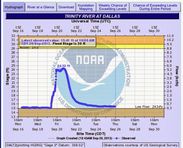 The Dallas Fort Worth area saw 3 to 6 inches of rain causing minor flash flooding and the Trinity River to rise some 15+ feet above normal. The average flow through Downtown Dallas is some 500-600 cubic feet per second, after the heavy rains the flow was ten times that, over 5,000 cubic feet per second.