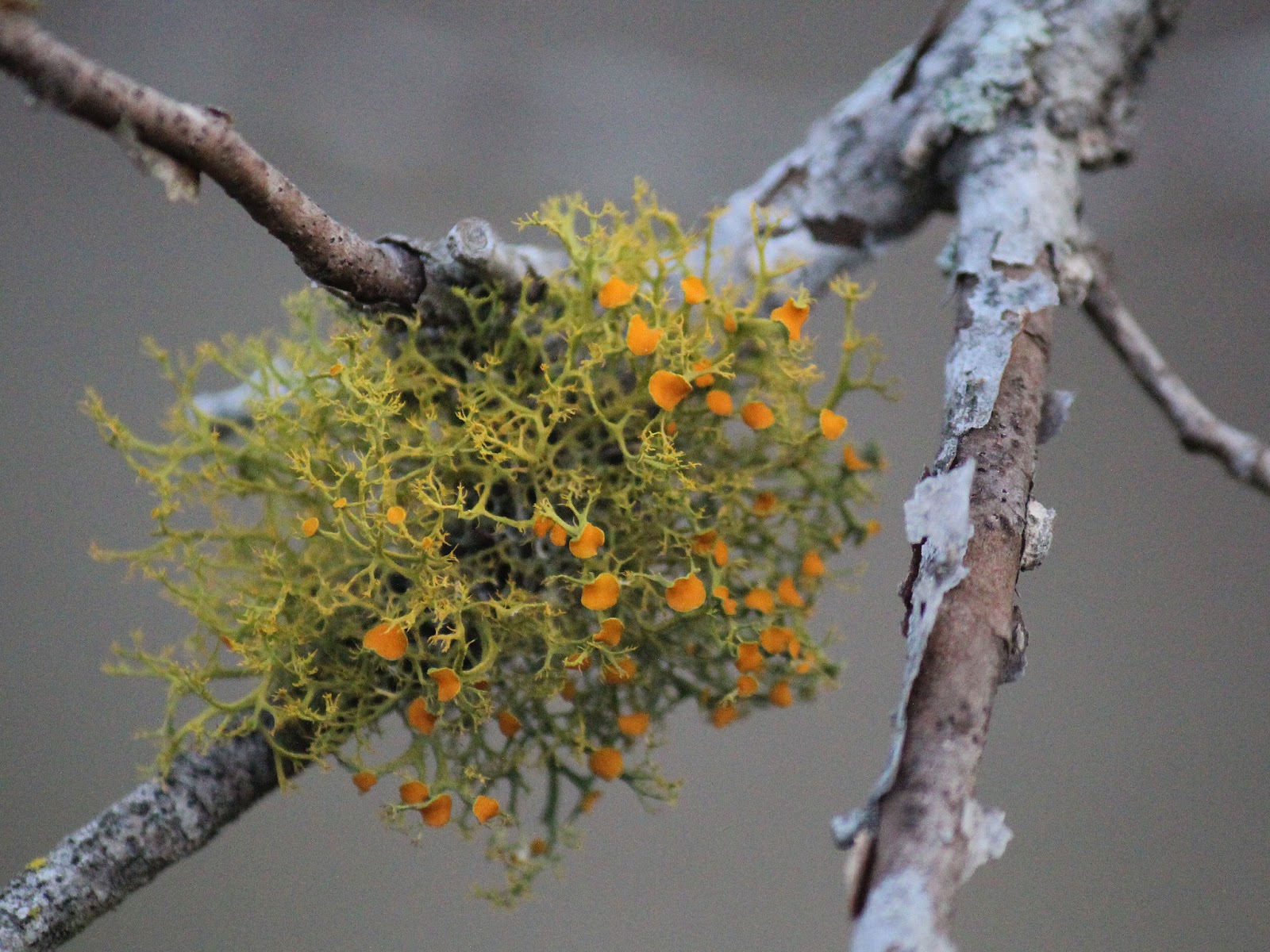 Fruticose (spore-producing) and Foliose (leafy)lichens on a branch of a tree in the Post Oak Preserve. Lichens consist of a photosynthetic and fungus partner, either an alga or cyanobacteria, and can live in harsh environments where neither partner could survive or reproduce alone. This is a Golden eye lichen (Teloschistes chrysophthalmus).