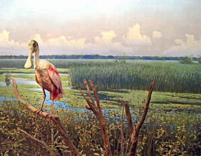 The real scene from 75 years later at Lemmon Lake above of a near identical Roseate Spoonbill is one where you realize how much of a master Reveau Bassett was at color and light. Stood the test of time. The dioramas are looking a little ratty these days. Since the dioramas are now historical art, generous foundations have stepped forward to preserve them. The Hoblitzelle Foundation, The Harry S. Moss Foundation, The Constantin Foundation and The Charles E. Goddard Foundation. It’s a great investment in preserving a piece of the past, for the future.
