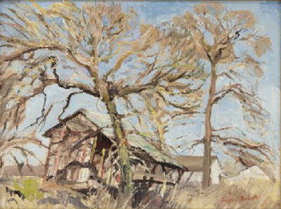 Reveau Bassett also painted old cabins in Dallas County. The one in the painting below, bracketed by two large trees looks near identical to the old abandoned Japanese Truck Farm shacks at Joppa Preserve.