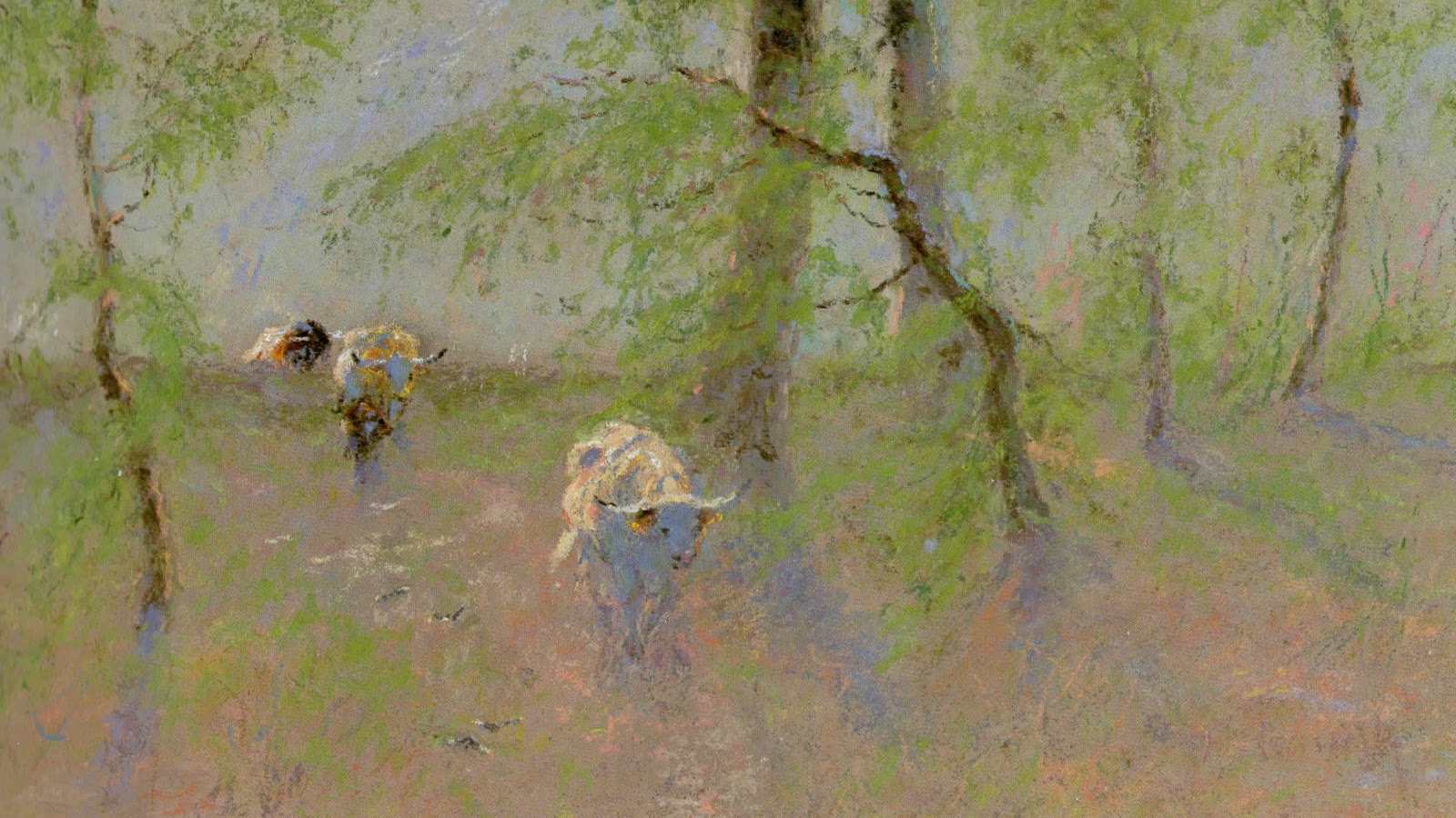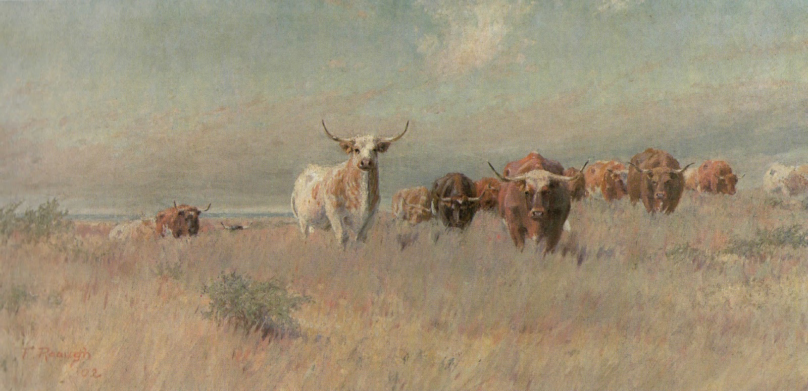 Reaugh, on his own or without knowledge of the impressionist movement in Europe became his own self taught plein air painter. Many of the French impressionists at the time were doing similar work painting out-of-doors. He was doing the same among the open prairies and bottoms of North Texas. For Reaugh, it was always about the animals and subtle light in the scenes, not the cowboys and wild scenes that his contemporaries Charles Russell and Frederick Remington enjoyed as subjects.