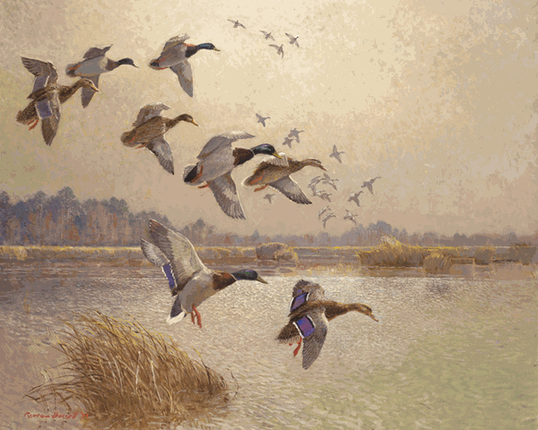 As a youth, Reveau Bassett hunted and trapped along the Trinity River with his father, studying and sketching the birds and animals as they migrated through the territory. At the age of 12, he became a student of Frank Reaugh. Later joining him on sketching trips across the country. Like many famous Texas impressionists, from Reaugh he learned the refined art of drawing and painting. He studied at the National Academy of Design and also at the Art Students League where he was taught by William Robinson Leigh. Bassett quickly became widely known for his paintings of ducks and other migratory birds.