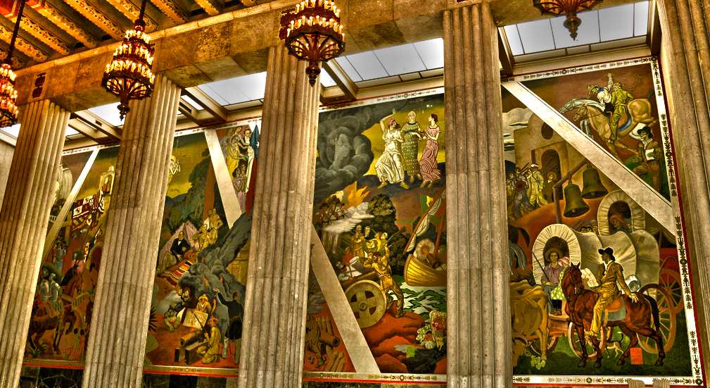 At its June 1936 dedication, former Gov. Pat Neff called the Hall of State “The Westminster Abbey of the Western World.” In the great chamber of the Hall of State, Eugene Savage, a New York artist, assisted by Reveau Bassett and James Buchanan Winn painted scenes depicting Texas history. These murals are 80×30 feet in a modified Byzantine style.