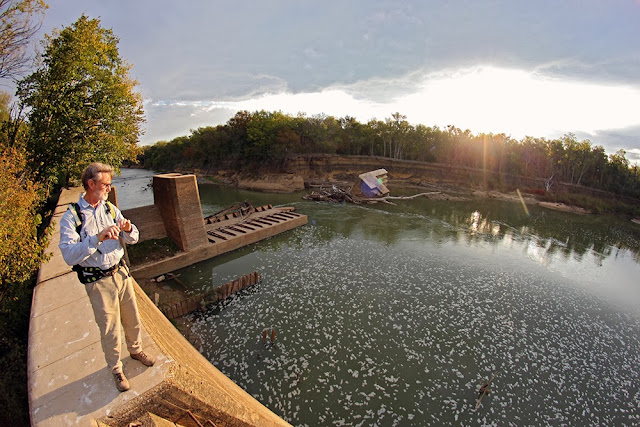 The approach to Lock and Dam #4 is aided by the long ago silted in lock box that once allowed boats to be lifted and lowered by manipulation of the water level. Above in the photo, all but 5-6 of the original 2 dozen or so rungs of a concrete fixed steel ladder are visible. The rest of the rungs sit many feet under years of flood silt.