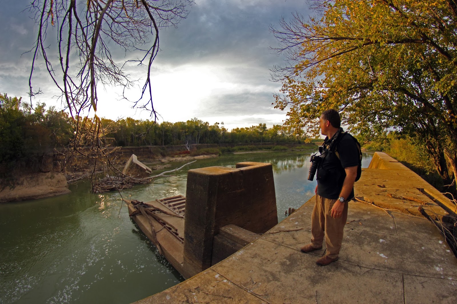 | Remains of the floodgate system and east bank in the background, note the toppled over concrete foundation in the background |