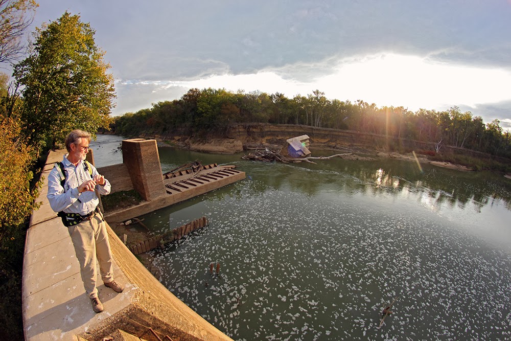 The approach to Lock and Dam #4 is aided by the long ago silted in lock box that once allowed boats to be lifted and lowered by manipulation of the water level. Above in the photo, all but 5-6 of the original 2 dozen or so rungs of a concrete fixed steel ladder are visible. The rest of the rungs sit many feet under years of flood silt.
