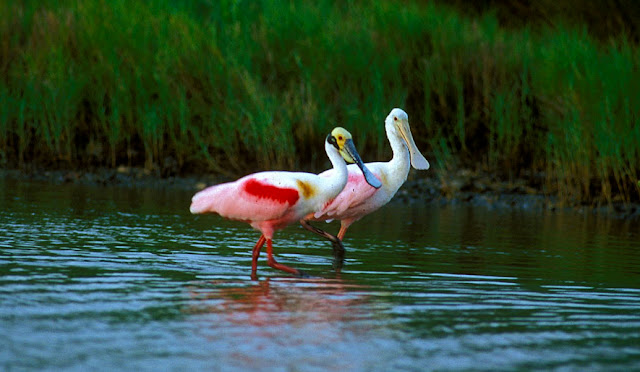 Spoonbills consume a varied diet of small fish, amphibians, aquatic invertebrates, and some plant material. They feed in the early morning and evening hours by wading through shallow water with their bills partially submerged. As a Roseate Spoonbill walks it swings its head back and forth in a sideways motion. When the bird feels a prey item it snaps its bill closed, pulls the prey out of the water, and swallows it.
