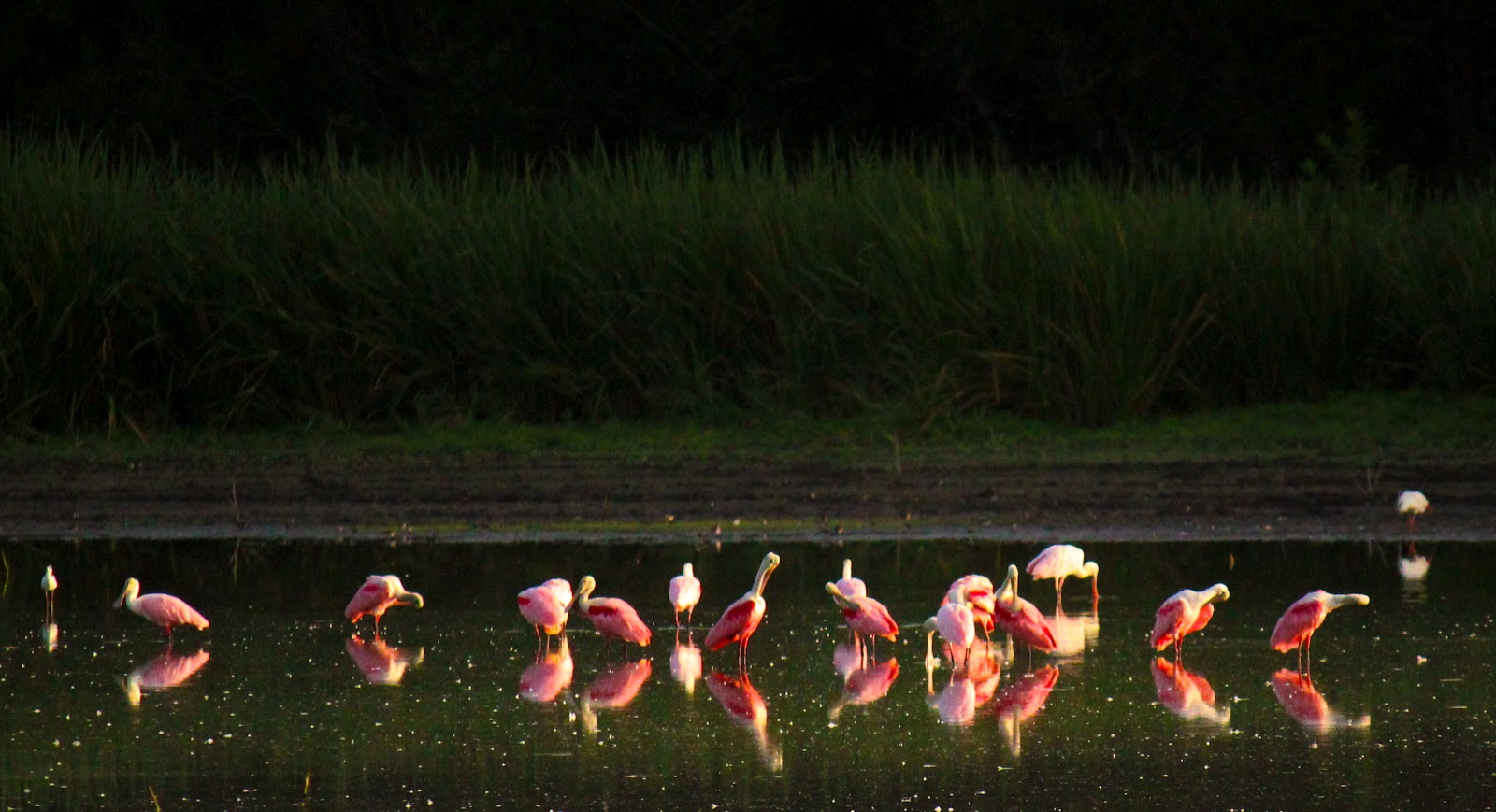 | Roseate Spoonbills in the first morning rays of sun at Lemmon Lake Dallas, Texas |