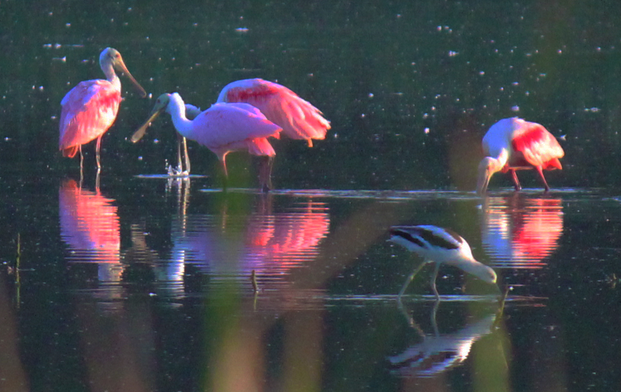 Spoonbills, which share the same pink plumage and long twiggy legs as flamingos, are actually members of the ibis family. Generally smaller than flamingos, roseate spoonbills grow to a height of 32 inches with a wingspan of 50 inches, have shorter necks, and longer, spoon-shaped bills. They are found along the south Florida coast from the Florida Keys north to St Joseph Bay, with some populations in northeastern Florida and along the coasts of Texas and Louisiana. The worldwide population is only 175,000 with 30,000 living in North America. Whittling down that number further, many of those 30,000 live in Florida, the Caribbean or along the Gulf Coast. It is estimated that there are 5,500 breeding pairs in the USA. I wonder seeing 18 individuals here in Dallas, what percentage of the Texas population away from the coast this represents. I imagine many fly up from south of the Rio Grande and are not breeding in the US during the spring.