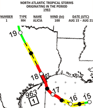 Father Tim remarked that during a hurricane in 1983 that he observed Roseate Spoonbills off Loop 12 near I-45. He said that the birds appeared to have been storm blown to some extent maybe removed from the coast by the heavy winds and rain. I was able to look back through his bird reports, find the date and trace it to Hurricane Alicia which hit the west end of Galveston Island in August 1983.