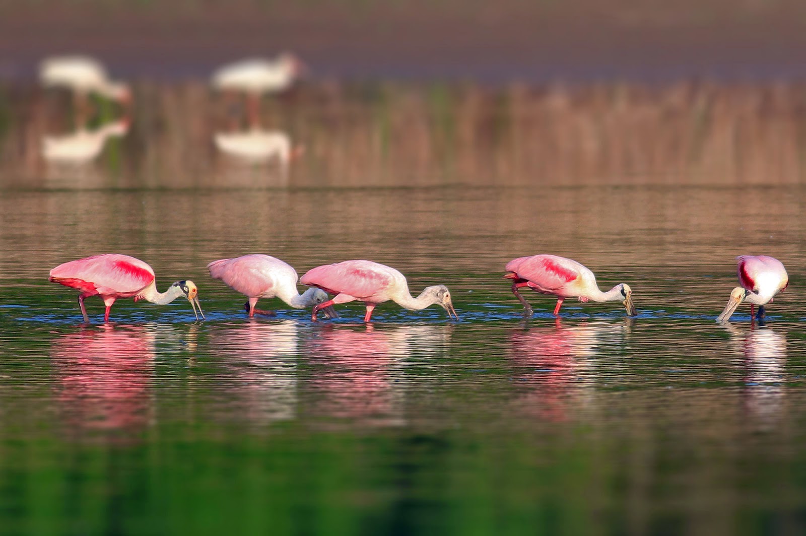 | Roseate Spoonbills preparing for an evening of feeding at Little Lemmon Lake |