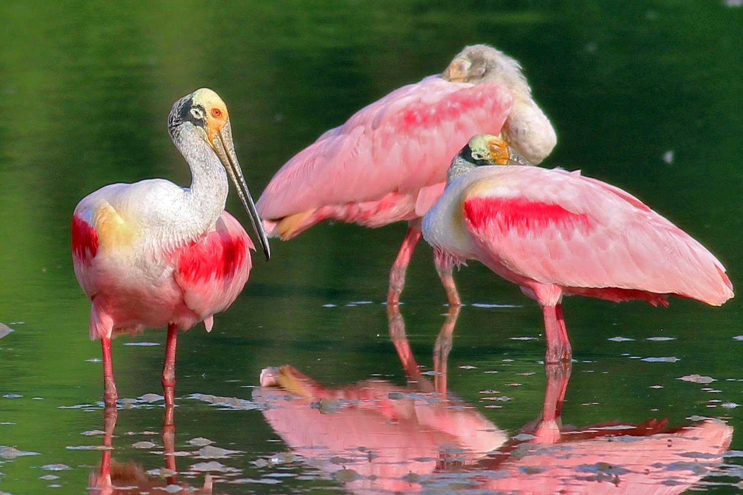 There are only two large pink hued birds in the United States, the Pink Flamingo and the Roseate Spoonbill. Natives of the sub-tropics, tropics and coastal areas, seeing either of the two species in the United States makes for a rare sight.