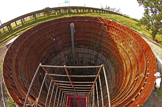 I bet a million people pass within rock throwing distance of this ten story deep hole everyday and don’t even know it’s there. It’s big. It’s deep. It’s spooky. Larger than a missile silo and if above ground would rival an office building or two in size Downtown. This hole is part of a Dallas public works project to tunnel underneath the Trinity River. The project is supposed to link the east and west banks of the Trinity River water system, carrying via gravity waste water from the Downtown side of the river to the Central Wastewater Treatment Plant. A twin bored hole of similar size sits next to the Cadiz Pump Station not far from Old City Park. Construction of this project began in early 2012 I believe. In the past year the site for whatever reason has sat empty. The fencing, signs and equipment all disappeared with the passage of time. So, we’re left with this big hole.