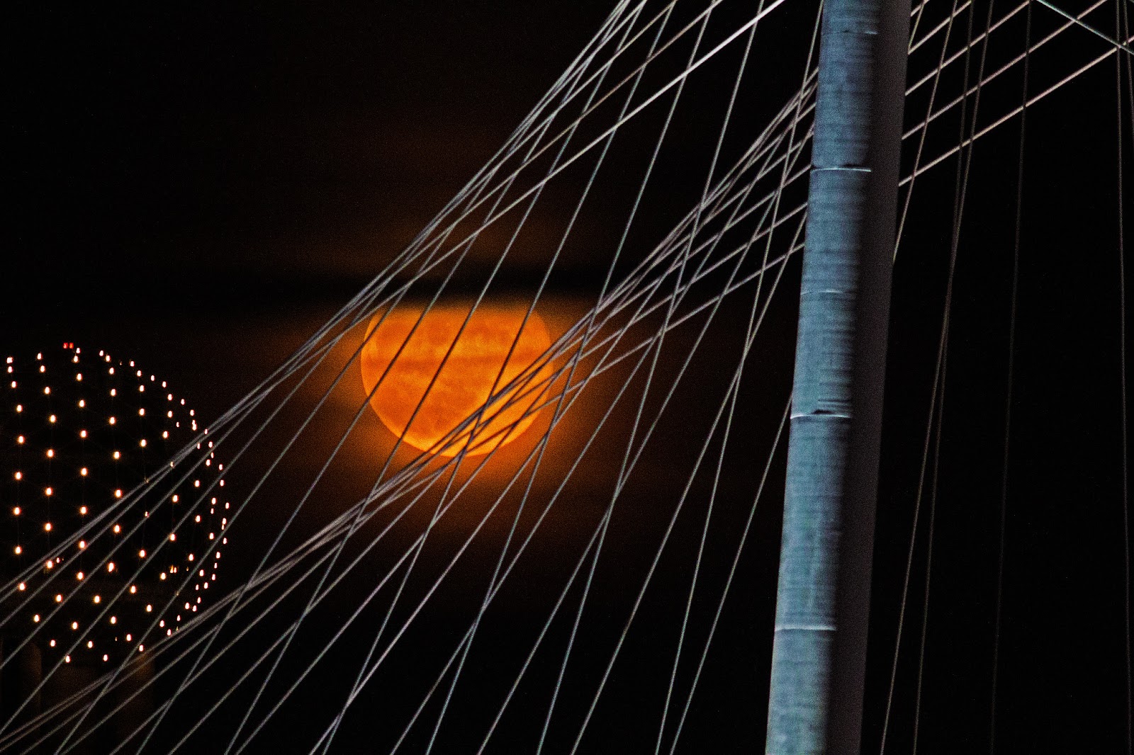 We live with the Moon and see a Full Moon every 28 days. Few realize the speed that it travels across the night sky until they watch it move across the night sky. Great vantage points and worth attempting sometime if you have a camera that can be manually set. The bright white lights of the bridge make for a challenging shoot, there are tradeoffs with getting details of the Moon or details of the bridge.