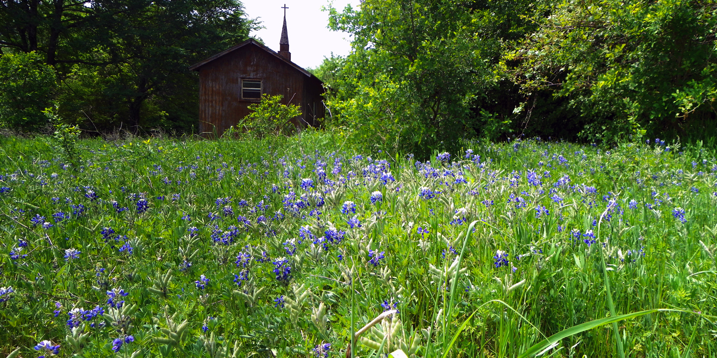 | Small chapel among bluebonnets at McCommas Preserve |